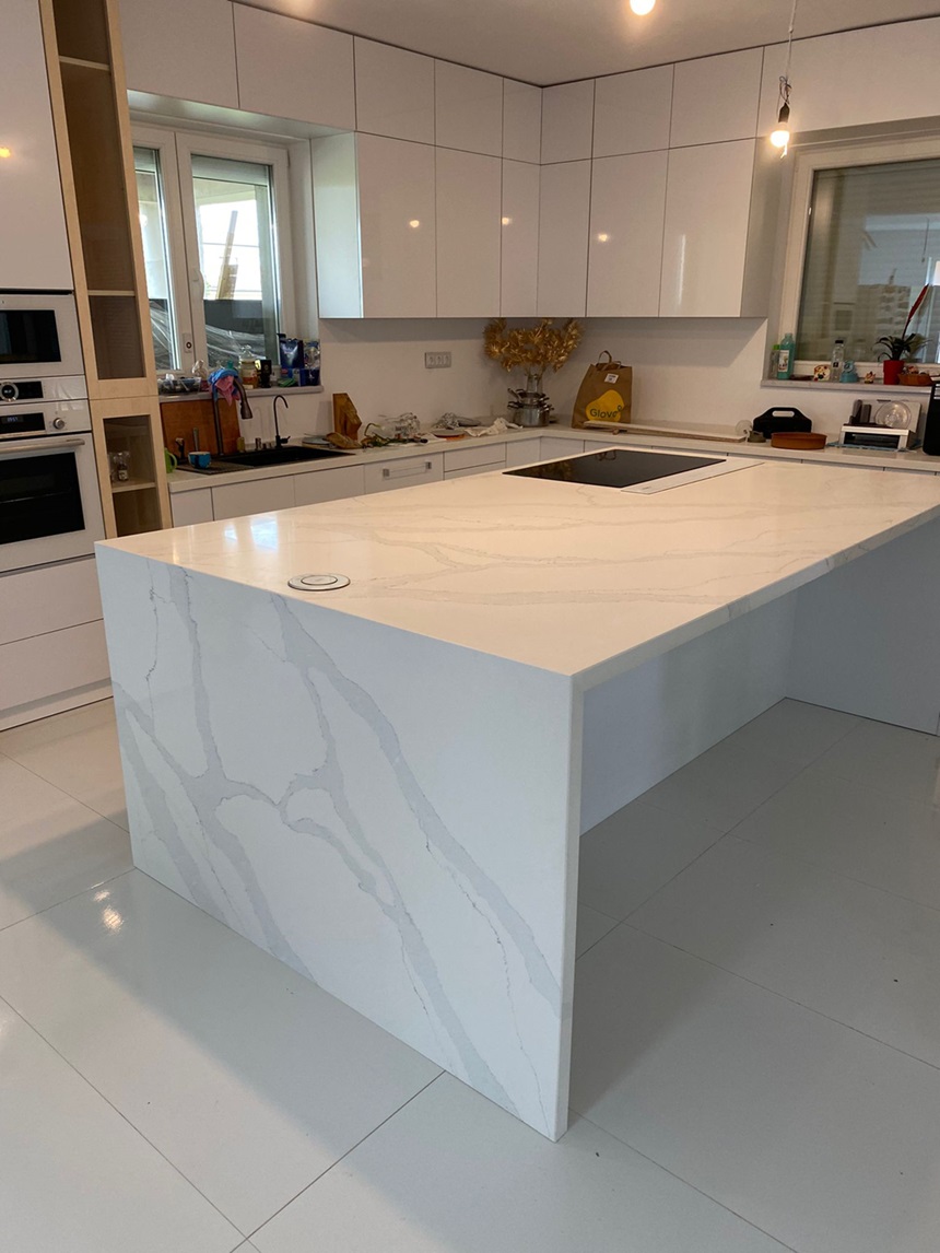 Compozit Cuart Calacatta Venato, Lastra de 2 cm pentru blaturi de bucatarie. Dacă sunteți în căutarea unui blat de bucătărie din quartz în România, ați ajuns în locul potrivit!