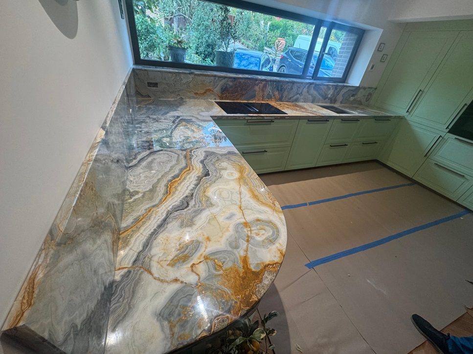 Versatilitate în Design: Onixul poate fi utilizat pentru o varietate de aplicații interioare, inclusiv blaturi de bucătărie, contrablaturi, pereți decorativi de accent și trepte de scări, oferind un aspect continuu și armonios.