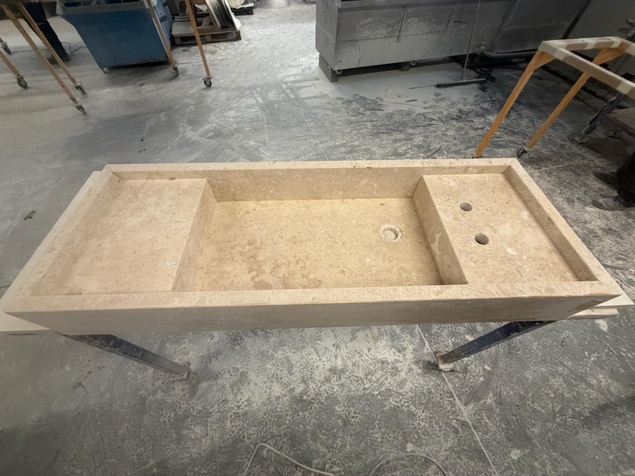Lavoar custom din Travertin Clasic Cross Cut Mat de 42x116x15 cm. Executam modelul respectiv din bloc masiv. Lavoarele noastre ofera un design elegant potrivit bailor dumneavoastra din piatra. Lavoare și Chiuvete din Piatra Travertin de la Rocas Decor. Ofera Eleganță și Personalizare pentru Baia Ta.