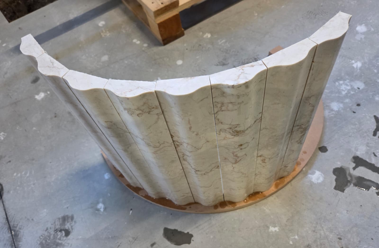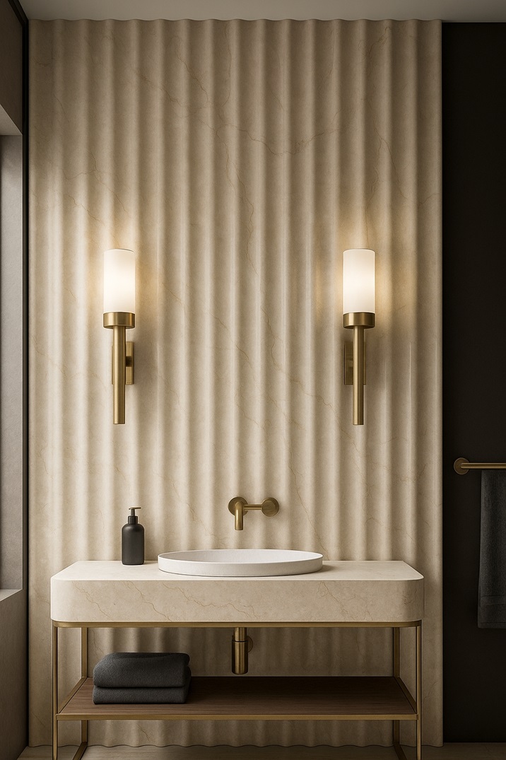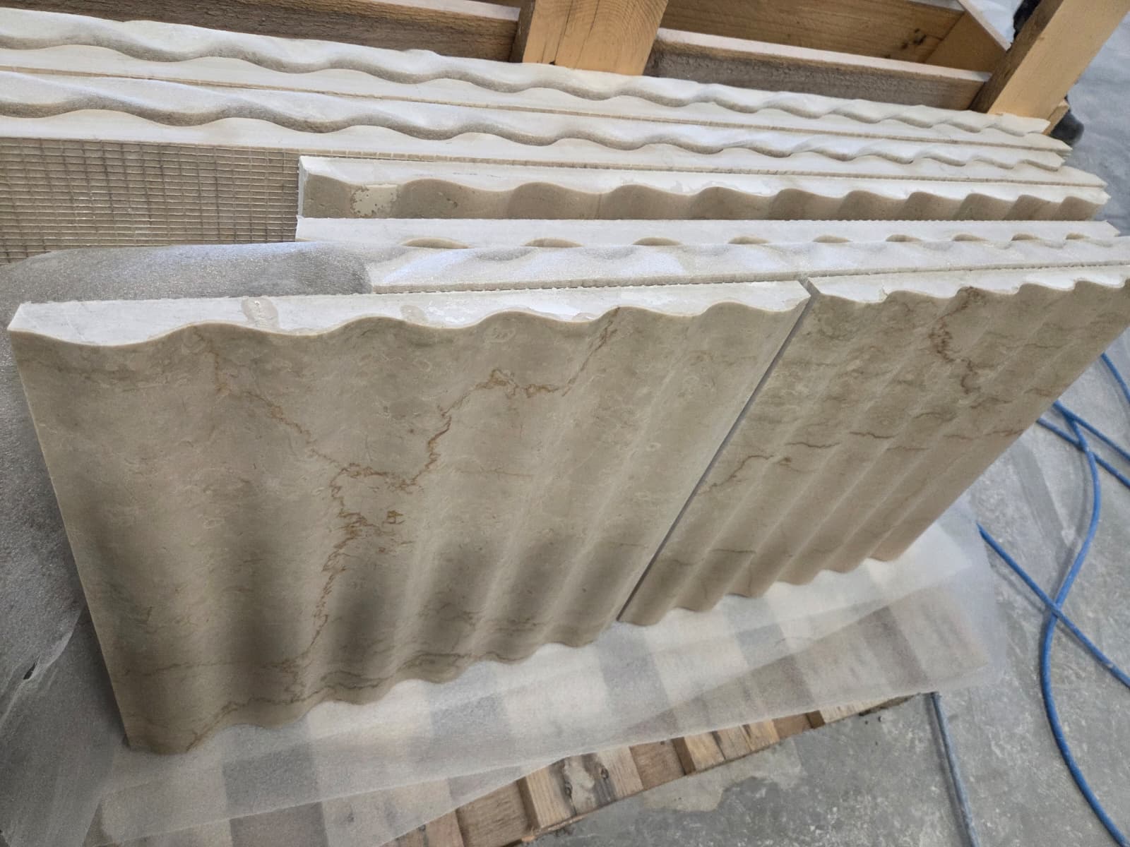 Panou Decorativ Din Marmura Ondulata Botticino de 3 cm. Panouri Din Marmura Decorativa Bej-Crem. Plăcile sunt prelucrate cu un profil ondulat (wavy / fluted) pe partea frontală — un finisaj decorativ de tip 3D, des folosit la lavoare, fronturi de mobilier, pereți accent sau insule de bucătărie. Suprafețele sunt bine finisate, cu margini netede și textură naturală vizibilă.