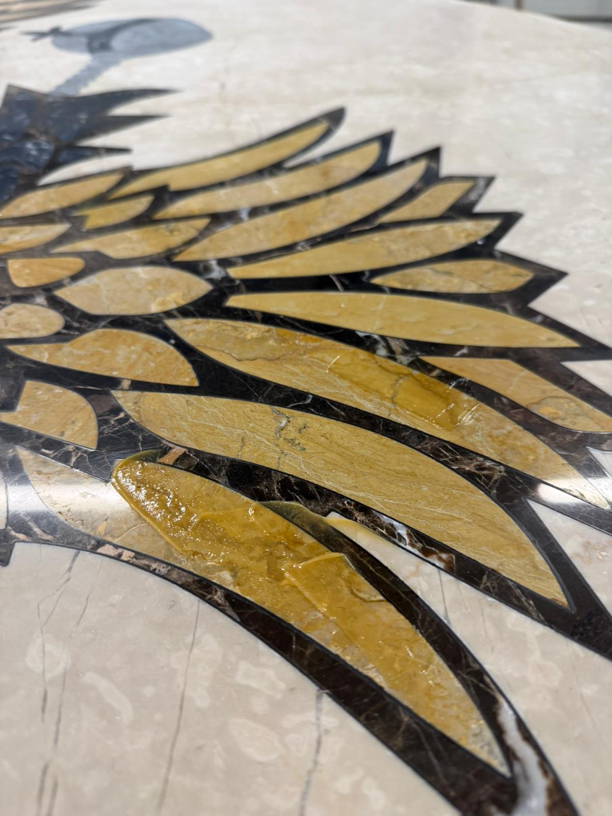 Vultur Bicefal Piatră Naturală Biserică Din Marmura diametru 180 cm calitate PREMIUM. Artă Sfântă în Piatra Naturală. La Rocas Decor, transformăm piatra naturală în opere sacre, create cu respect și credință. Fiecare medalion bisericesc  pe care îl realizăm este mai mult decât un element decorativ. Este o mărturie a devoțiunii și a măiestriei meșterilor noștri pietrari, care lucrează cu dăruire de peste 20 de ani pentru a înfrumuseța lăcașurile sfinte din toată țara.